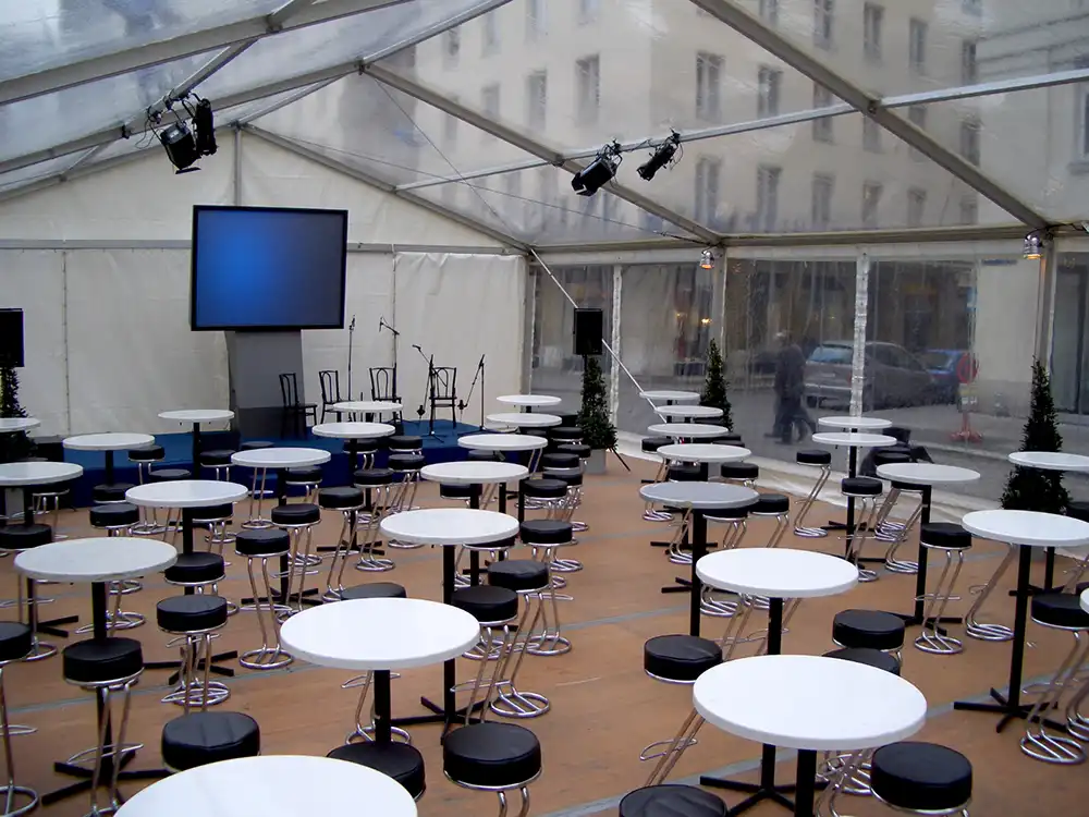 Die passende Ausstattung wie Tische, Stühle, Lounge, Bars und komplette Veranstaltungstechnik tragen zum Gelingen einer Veranstaltung bei.